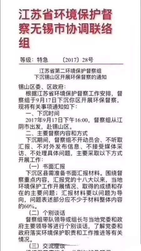 根据安排,从9月17日开始,环保督查组将下沉无锡市锡山区,重点检查本区域环境问题!
