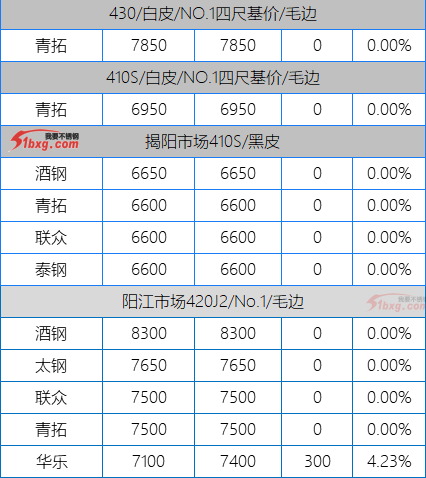 今日,青山代理报,J1-8150元/吨,J3-7950元/吨,J4-8650元/吨,J2-7750元/吨,交货期仍是3月10日前。市场贸易商整体报价波动不大,但价格依然有高低不一呈现。可见报价有,鼎信J2不含税报价7120-7150元/吨;北部湾新材报J5料7700元/吨,J1四尺8100元/吨,J1五尺8200-8250元/吨(期货8150);宝钢BN1TL窄带7600元/吨,大板7700元/吨;中金J3含税7530-7550元/吨;中金J5料、金海J3料、鑫峰J3料、永达J3料7380-7500元/吨。